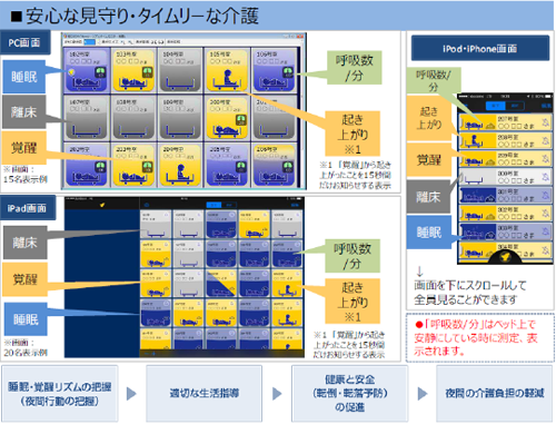 定期的な巡回以外に、こちらのシステムを利用して、適切な見守りや介護を実施できる体制を整え、安全確保に努めております。
